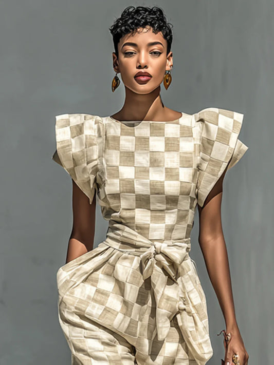 Women's Checkered Flutter Sleeve Belted Jumpsuit
