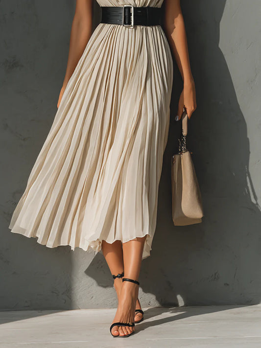 Women's Chiffon Pleated V-neck Sleeveless Belted Maxi Dress