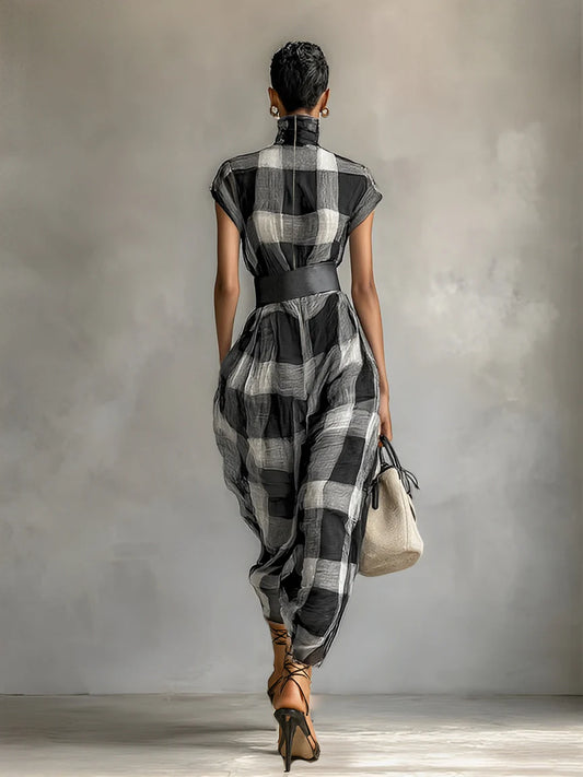 Women's Plaid Chiffon High Collar Short Sleeve Belt Maxi Dress