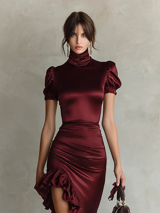 Women's Satin High Collar Short Sleeve Waist Hem Ruffle Maxi Dress