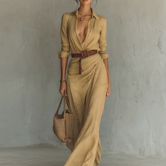 An elegant maxi dress featuring a classic lapel design, long sleeves, and a single-breasted closure. The belted waist enhances your silhouette for a polished, feminine look.