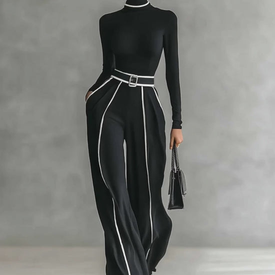 A sophisticated two-piece set featuring a turtleneck long-sleeve top with contrast white trimming and wide-leg pants. The set includes a matching belt to highlight the waist, offering a polished and coordinated look.