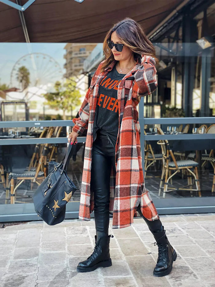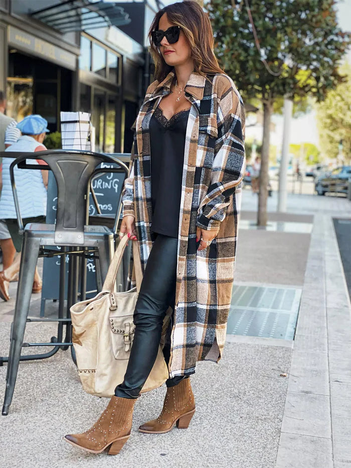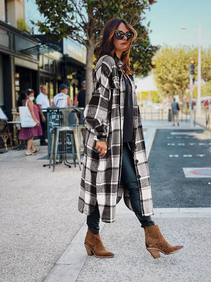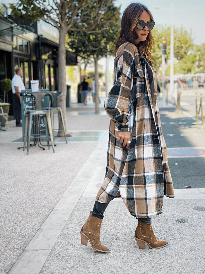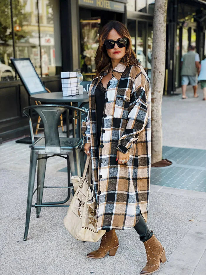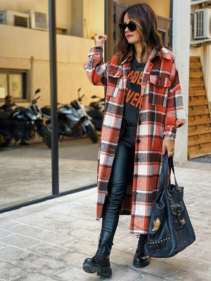 - Crafted with premium thick woolen plaid fabric, our Woolen Plaid Trench Coat is a timeless piece that offers elegance. The captivating plaid pattern adds a sophisticated touch to the design, while the long length provides added warmth and coverage. Two patch pockets on the chest and side pockets offer plenty of storage. This coat has drop shoulders, a button closure, and a classic lapel collar, giving a refined and polished look. Ideal for cooler months, this woolen coat elevates your daily outfits. Stay stylish and sophisticated in our Woolen Plaid Trench Coat.